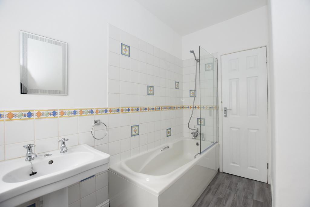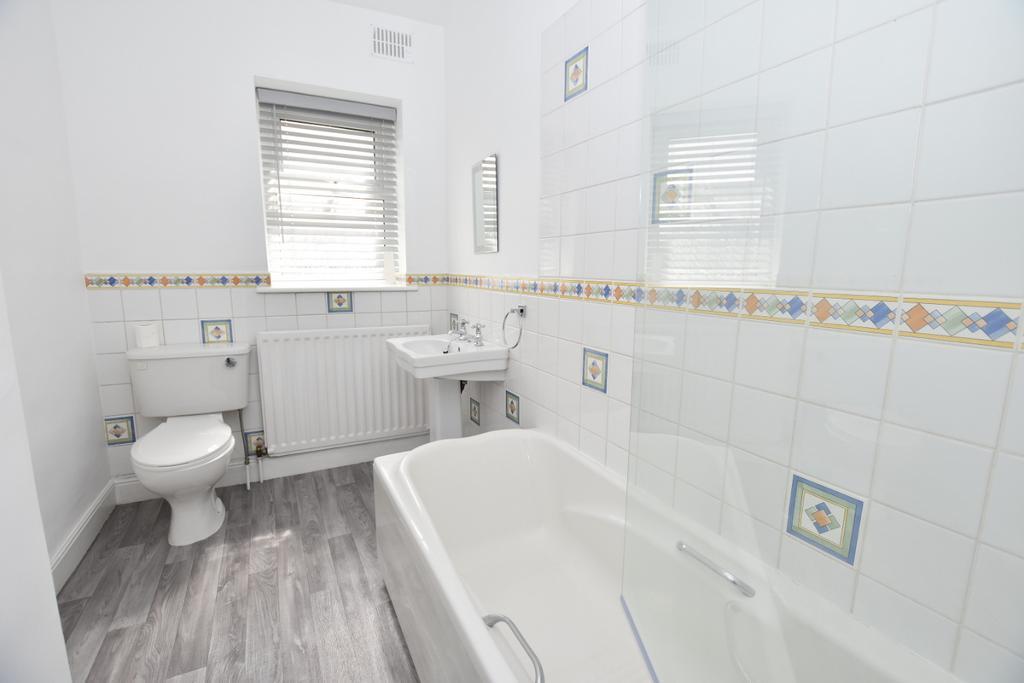 BATHROOM: Housing three-piece white suite comprising panelled bath with electric shower over, low-suite w.c. and pedestal washbasin.