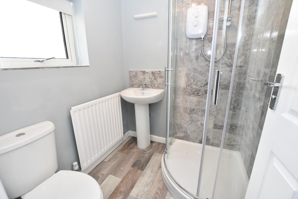 SHOWER ROOM: Housing 3-piece suite comprising low suite w.c., pedestal washbasin and walk-in shower enclosure with electric shower.