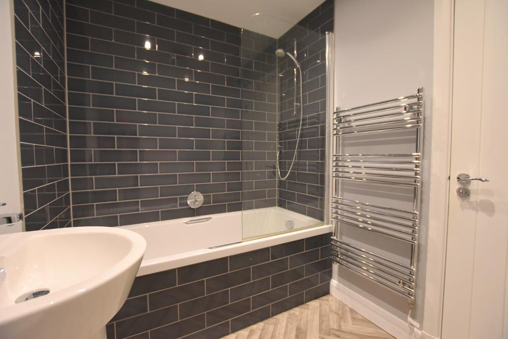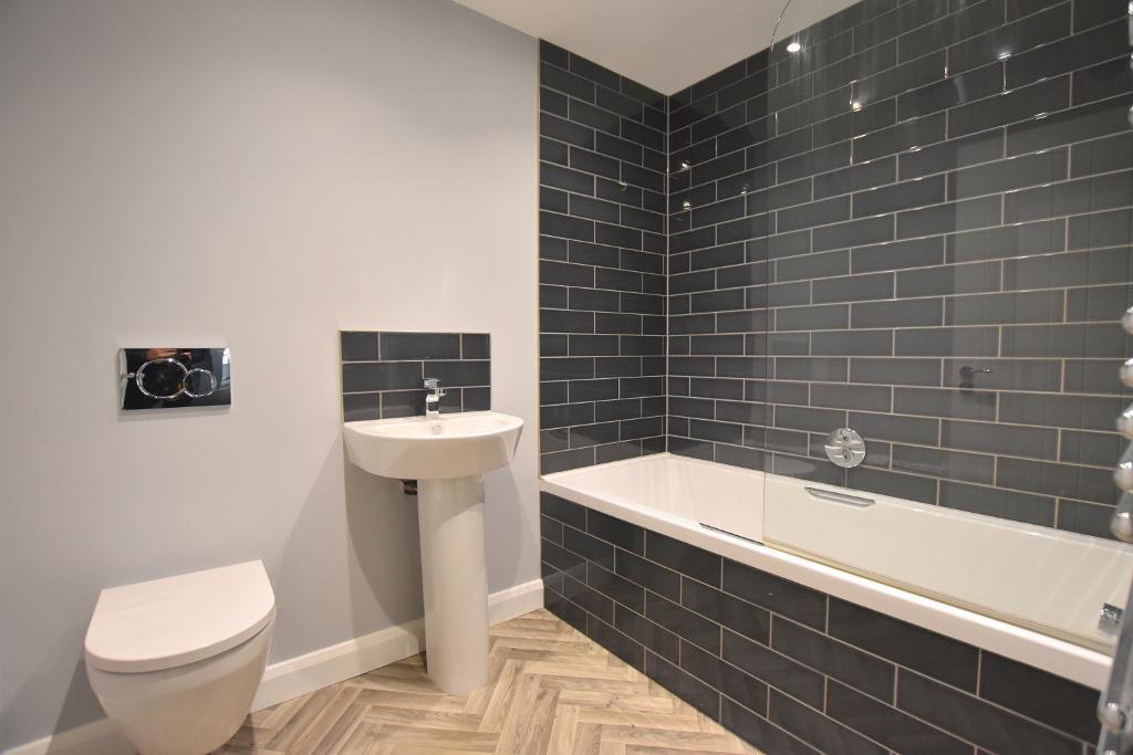 Bathroom: Housing three-piece suite comprising low suite w.c., pedestal washbasin and panelled bath with thermostatic shower over.