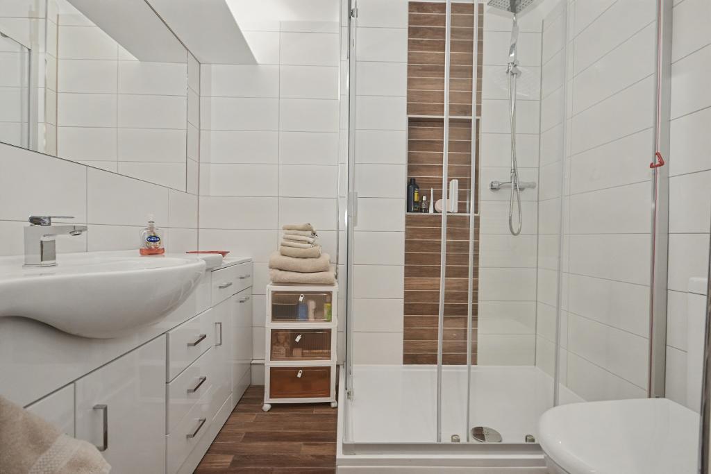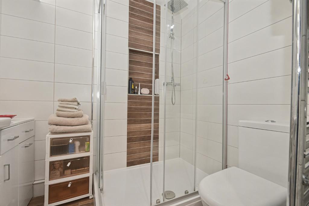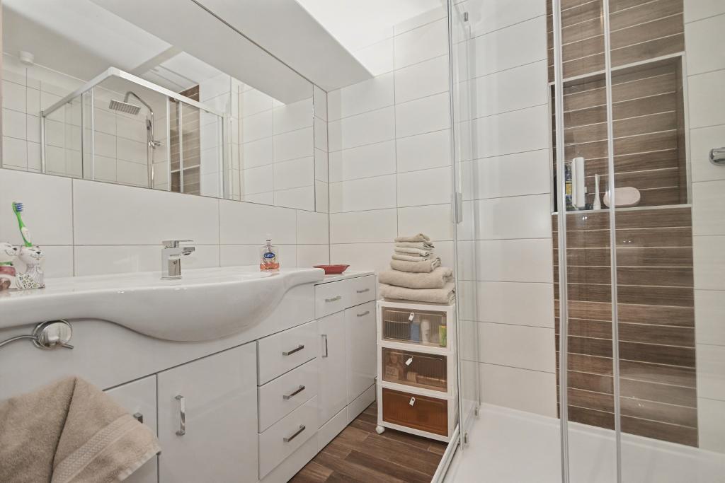 Shower room: With a modern 3-piece suite in white comprising a low level w.c., vanity wash-hand basin with built-in storage cupboards and a corner shower enclosure with plumbed shower, fully tiled walls, extractor fan, tiled floor and heated stainless steel towel rail.