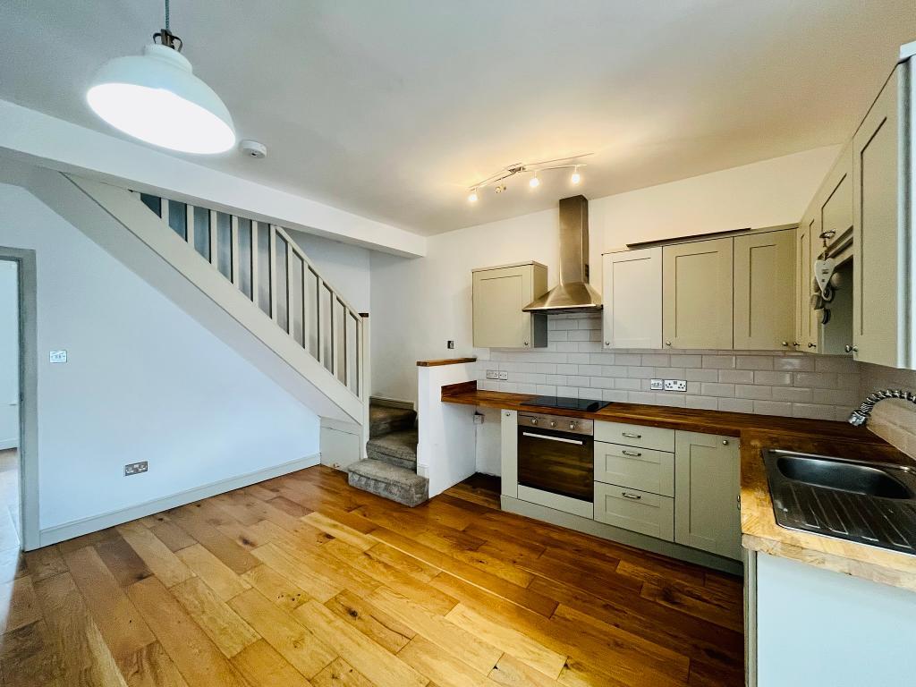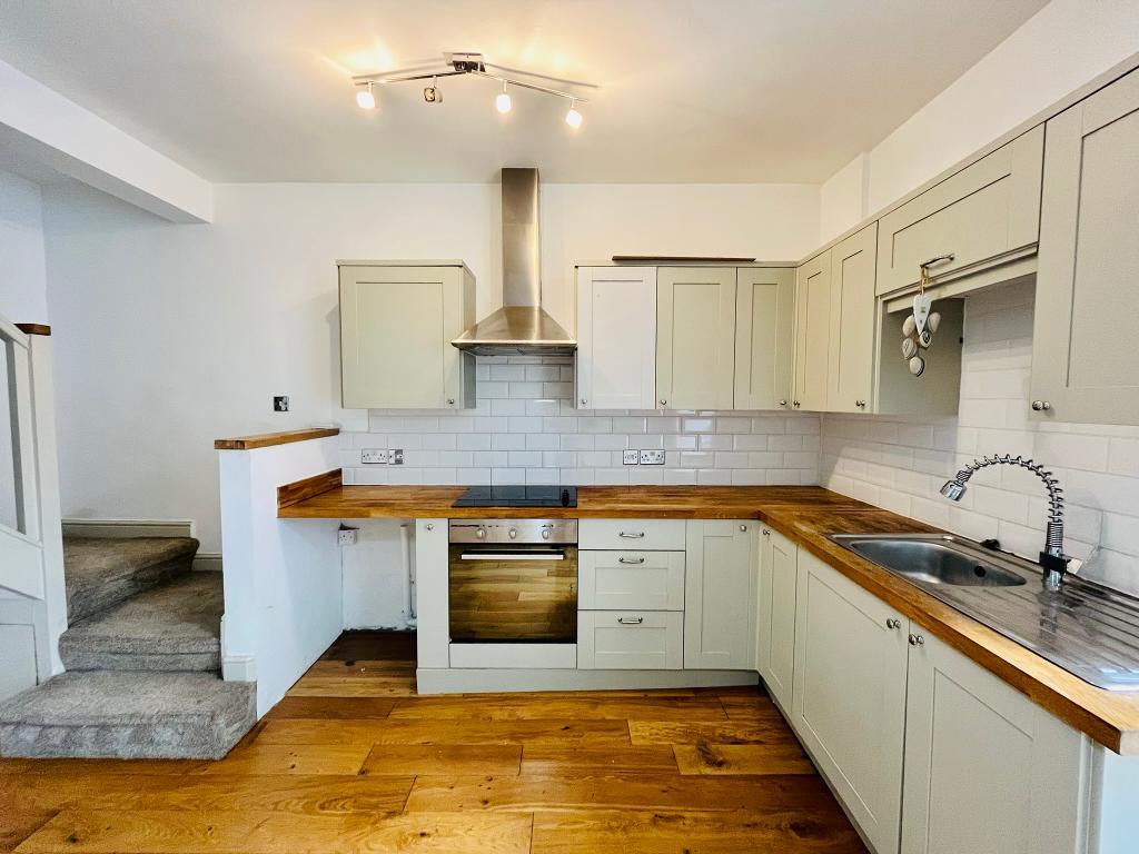 Dining kitchen: 6.1m narrowing to 4.5m x 3.8m (20' narrowing to 14"72 x 12'4"); with a range of attractive fitted wall and base units with solid wood working surfaces, integrated electric oven, 4-ring ceramic hob with extractor over, plumbing for washing machine, staircase to first floor, French doors to the rear.