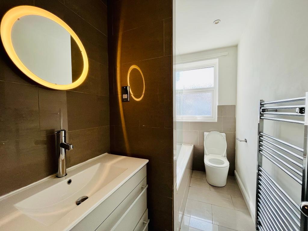 Bathroom: Housing three-piece modern suite comprising low suite w.c, panelled bath with thermostatic controlled shower over, vanity washbasin with drawers under.
