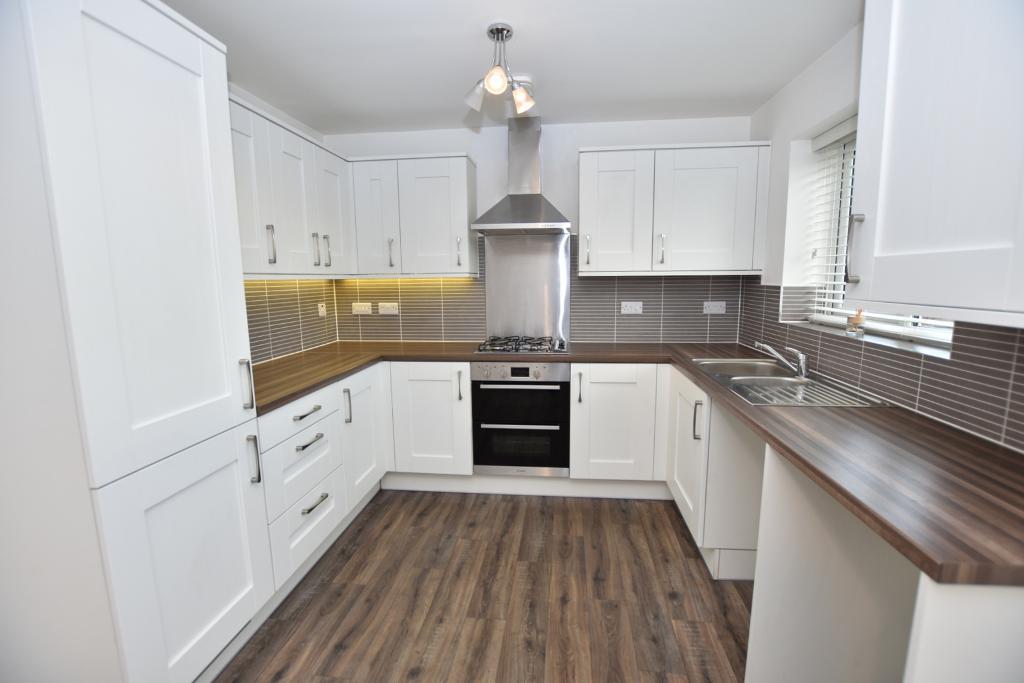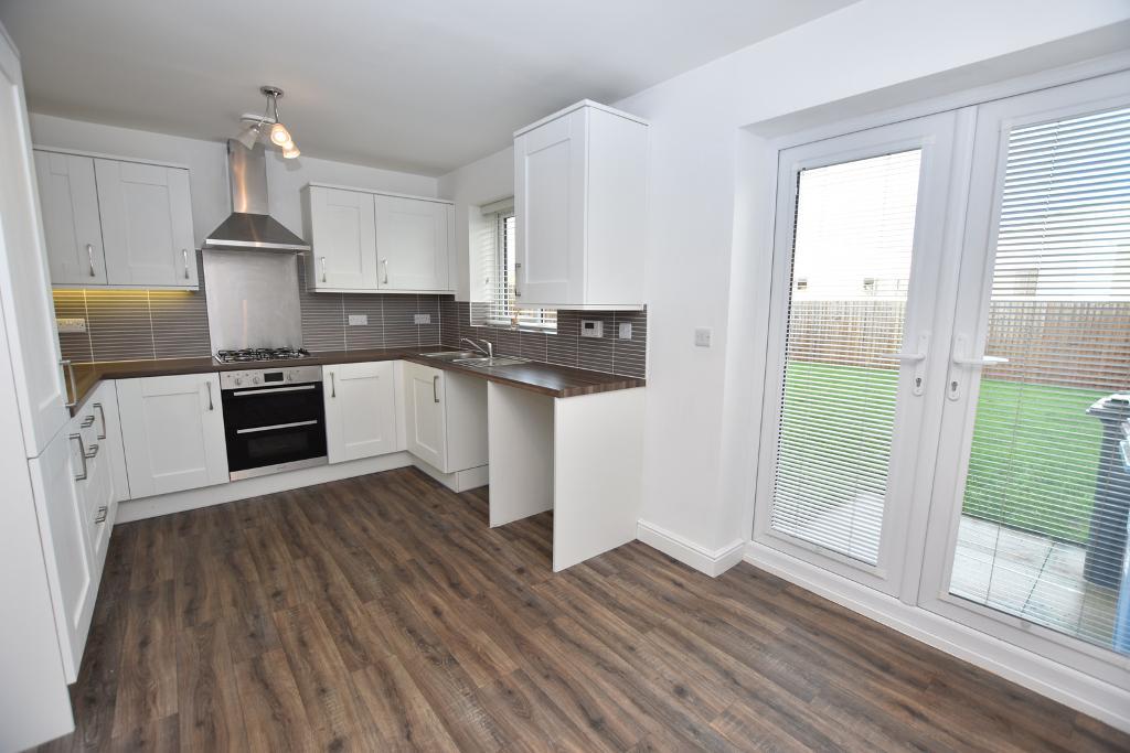 DINING KITCHEN: 15' 8'' x 9' 6'' (4.8m x 2.9m) With a range of shaker style wall and base units, wood effect laminate work surface preparation areas to three sides incorporating twin sink and drainer unit and four-ring gas hob with extractor over, Integrated fridge freezer, electric oven and grill and plumbing for automatic washing machine, French doors opening onto the rear garden and useful under stairs store cupboard.