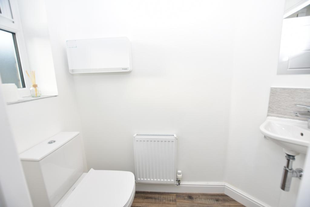 CLOAK ROOM: Comprising twin flush w.c and corner wash handbasin.