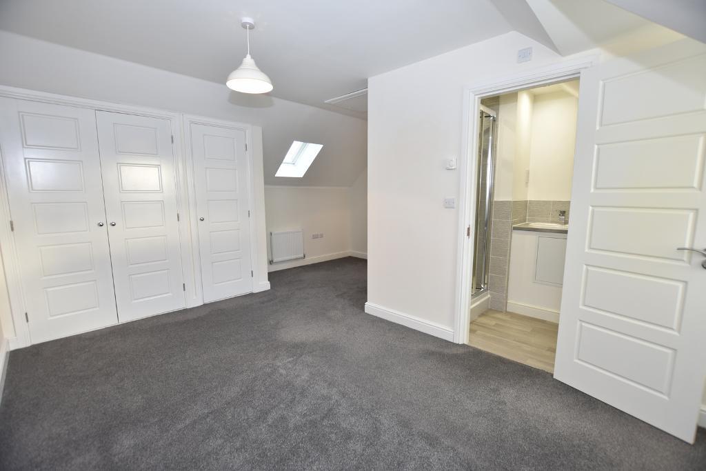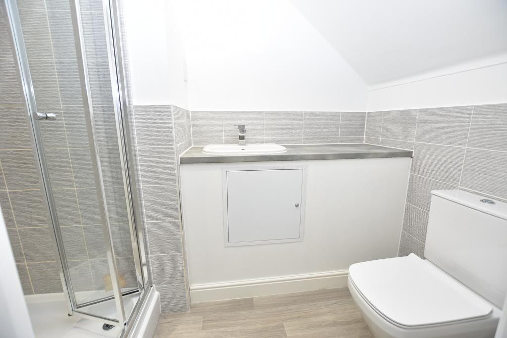 EN SUITE: Housing three-piece suite incorporating twin flush low level handbasin in vanity unit and fully tiled shower cubicle.