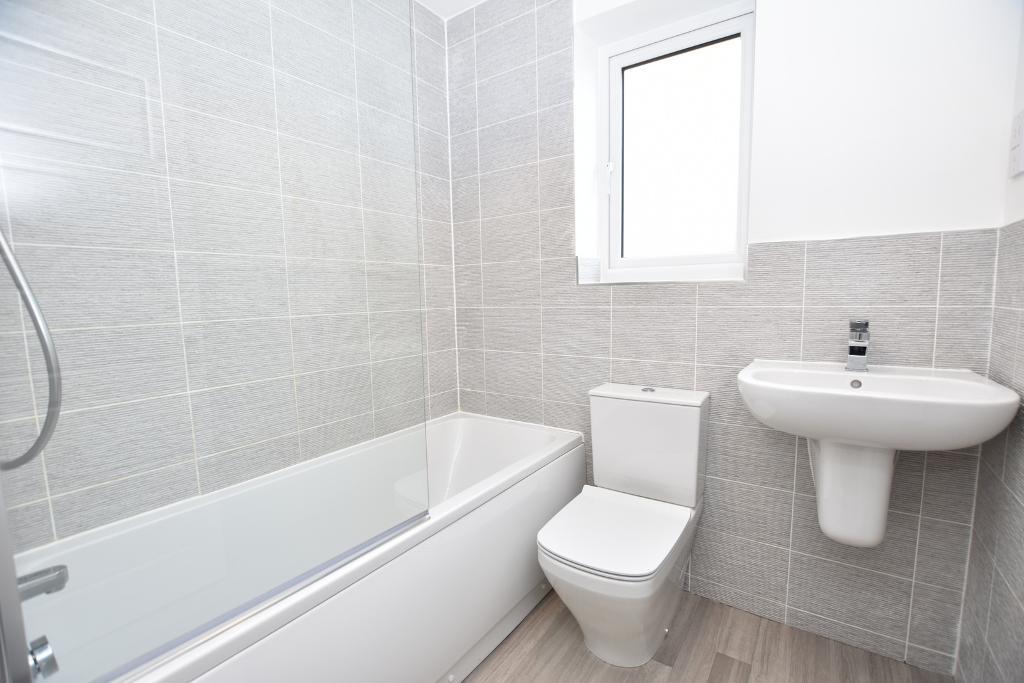 HOUSE BATHROOM: Housing stylish three-piece suite incorporating a twin flush low suite w.c, matching floating wash handbasin and panelled bath with shower over.