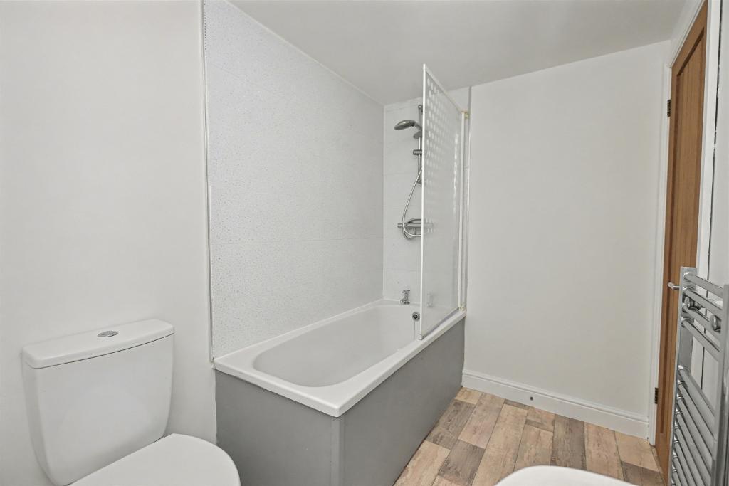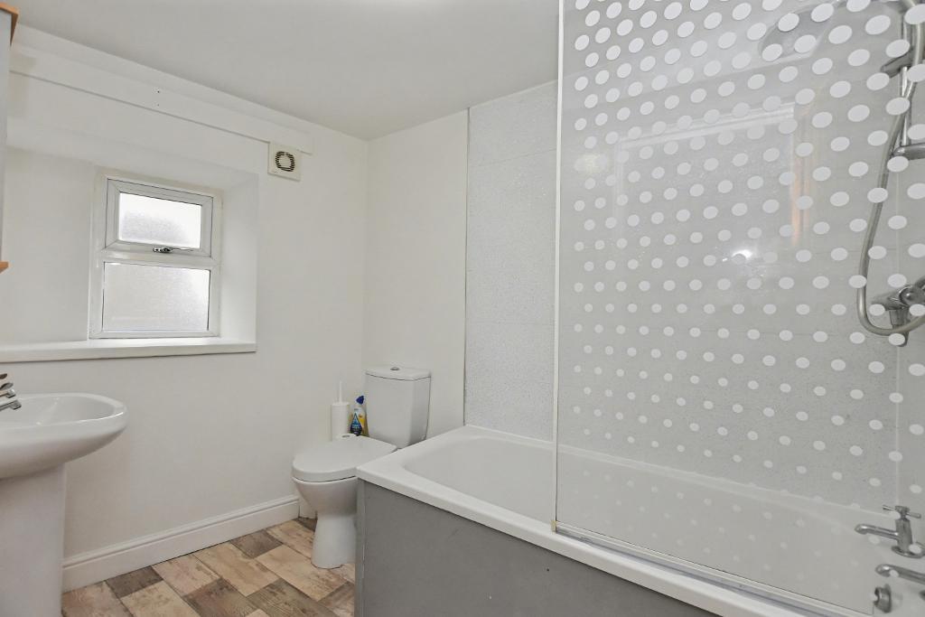 BATHROOM: With a 3-piece suite comprising a low level w.c. with push button flush, pedestal handwash basin with vanity cupboard, a panelled bath with plumbed shower, shower screen, extractor fan, vinyl flooring and stainless steel heated towel rail.