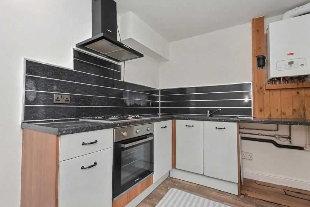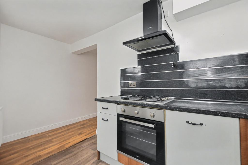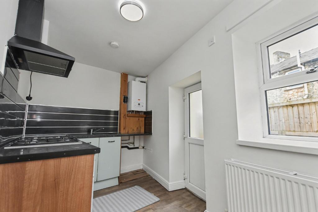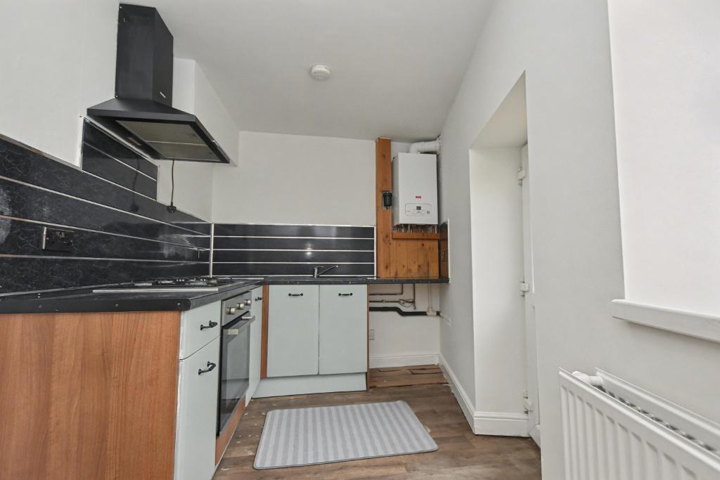 KITCHEN: 4.1m x 2.3m (13"6" x 7"5"); with vinyl wood effect flooring, a range of fitted base storage cupboards with complementary work surface, plumbed and drained for an automatic washing machine, 4 ring gas hob, extractor over, splash back, electric oven, space for a fridge/freezer, single drainer sink unit, central heating radiator, wall mounted central heating combi boiler and part glazed UPVC external door to the rear of the property.
