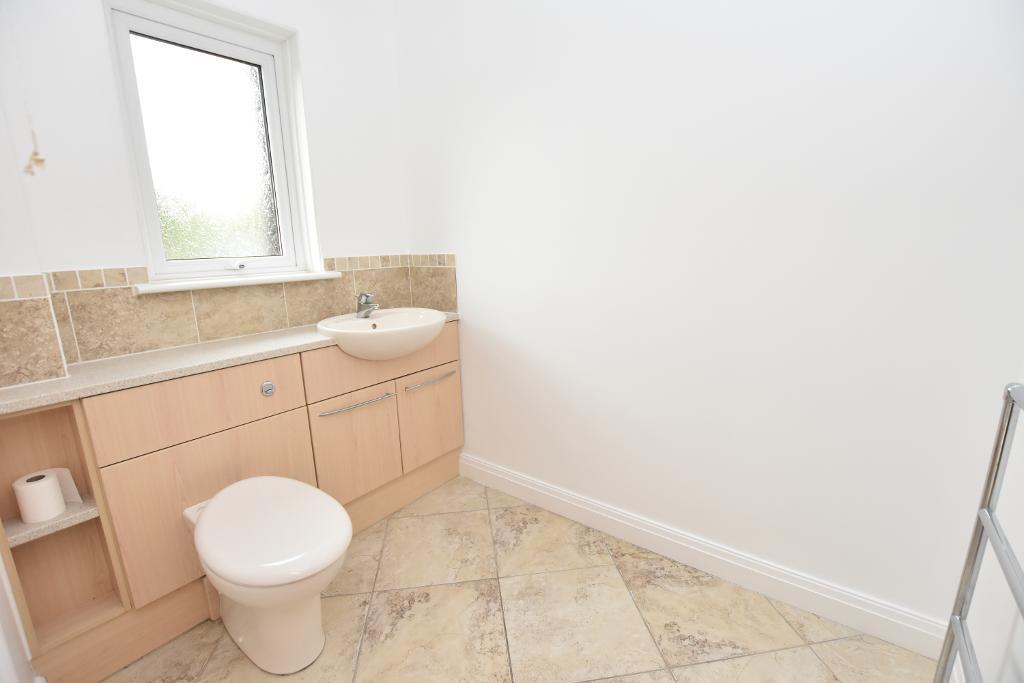 Cloakroom: With 2-piece white suite comprising low suite w.c, vanity wash handbasin with storage cupboards under and chrome heated ladder style towel rail.