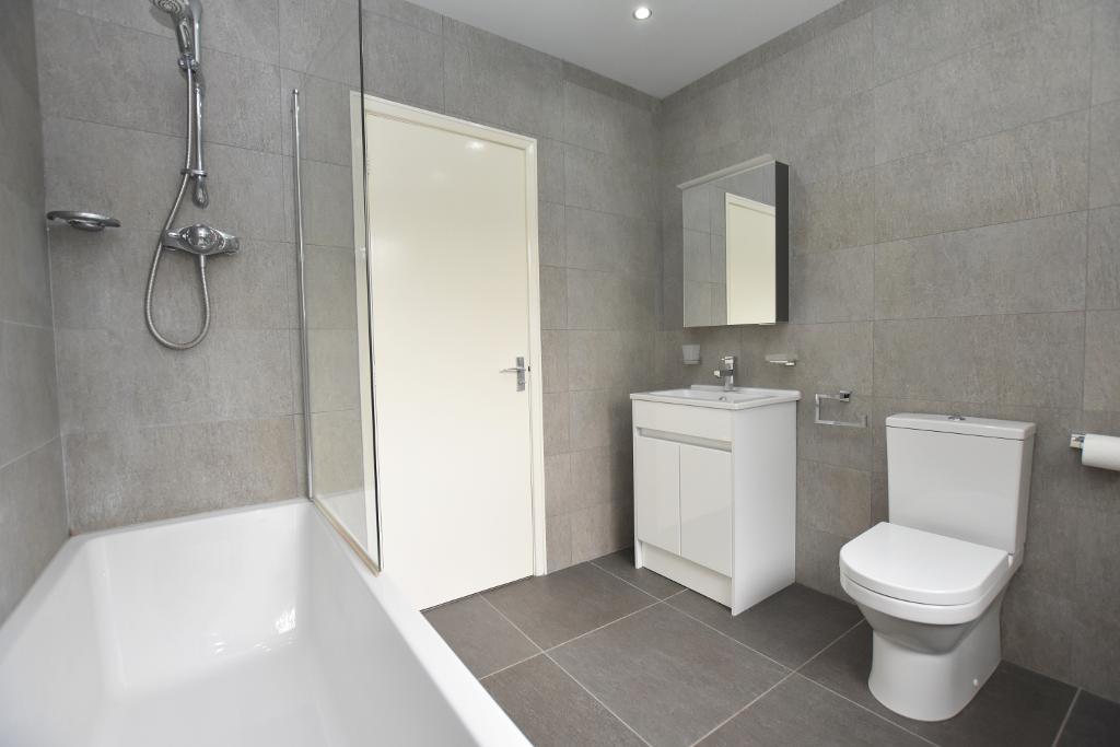 House bathroom: Housing modern three-piece white suite comprising low suite w.c, vanity washbasin, panelled bath with chrome mixer tap and thermostatic shower over, glass shower screen and heated ladder style towel rail.