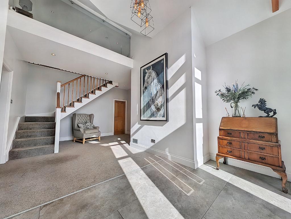 Entrance hallway: With composite external door, vaulted ceiling with open beams, part-tiled/part-carpeted floor, staircase to the first floor landing with glass and oak balustrade and low voltage lighting.
