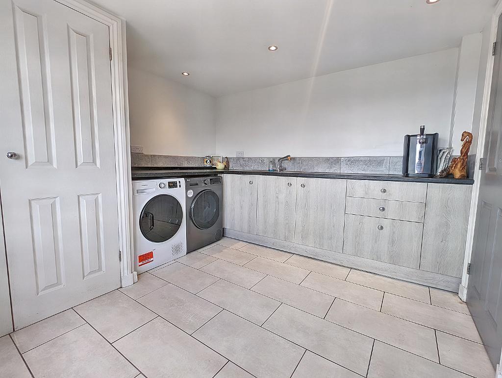 Utility room: 3.1m x 3.3m (10'2" x 10'11"); with a range of base and wall level storage cupboards, built-in cupboard with hot water cistern, single drainer stainless steel sink unit, plumbed and drained for an automatic washing machine, ventilated for a tumbler dryer, tiled flooring, tiled splashback and UPVC external door to the rear of the property.