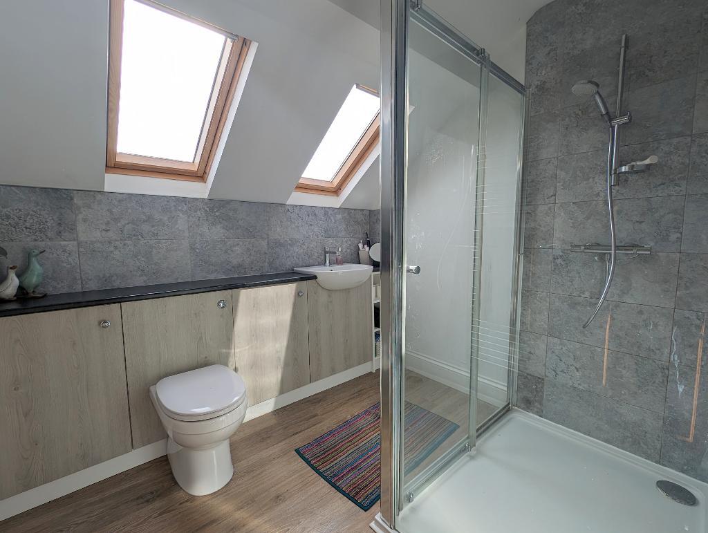 En-suite shower room: With a 3-piece suite in white comprising a concealed low level w.c., vanity wash-hand basin and a shower enclosure with plumbed shower, part-tiled walls, low voltage lighting, extractor fan, heated stainless steel towel rail and 2 Velux windows.
