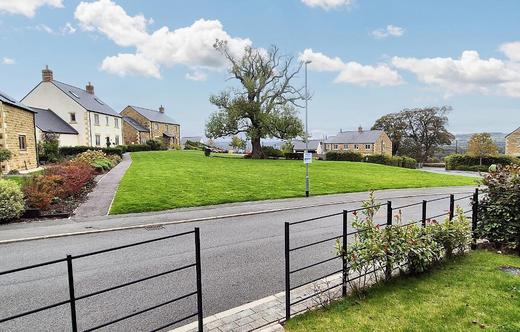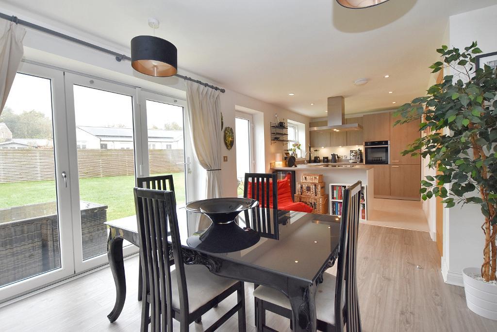 A fantastic modern detached house situated on this smart development with attractive outlooks across the central green to the front. This high specification house benefits from a Siematic kitchen with Neff appliances, Villeroy & Boch bathroom suites and modern central heating system with air source heat pump. The house is stone faced at the front with attractive PVC sash windows and feature estate railings surrounding the front garden, there is a large drive to the side with detached double garage and west facing lawned garden to the rear. The accommodation is arranged across three floors with a central hallway with cloakroom, two reception rooms to the front and at the rear is a full width family dining kitchen with bi-fold doors opening onto the rear garden. Upstairs on the first floor the master bedroom has a dressing area leading to an en-suite bathroom with large walk-in shower. There are two other double bedrooms and a large 4-piece bathroom. On the top floor there is a large landing currently used as a study area, double 4th bedroom, shower room and large walk-in airing cupboard.