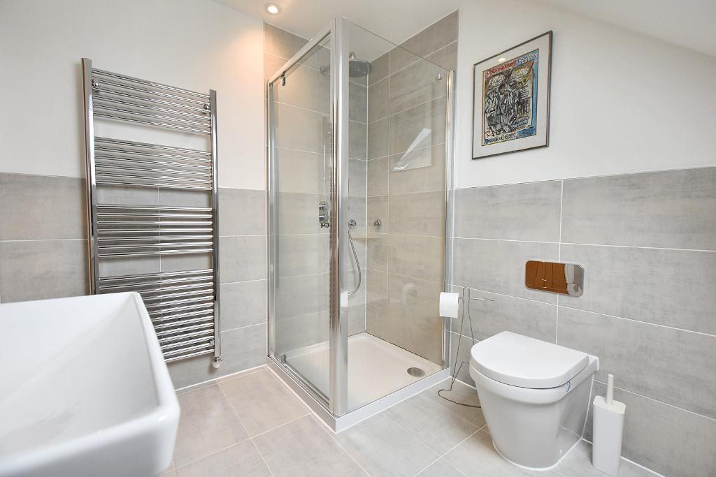 Shower room: 3-piece Villeroy & Boch suite comprising low suite w.c. with concealed cistern and chrome flush plate, wall-hung semi-pedestal basin with chrome mixer tap, corner shower enclosure with fitted thermostatic shower with fixed showerhead and separate handheld showerhead, chrome heated ladder style towel rail, part-tiled walls, tiled floor, recessed spotlighting, extractor fan and Velux window.