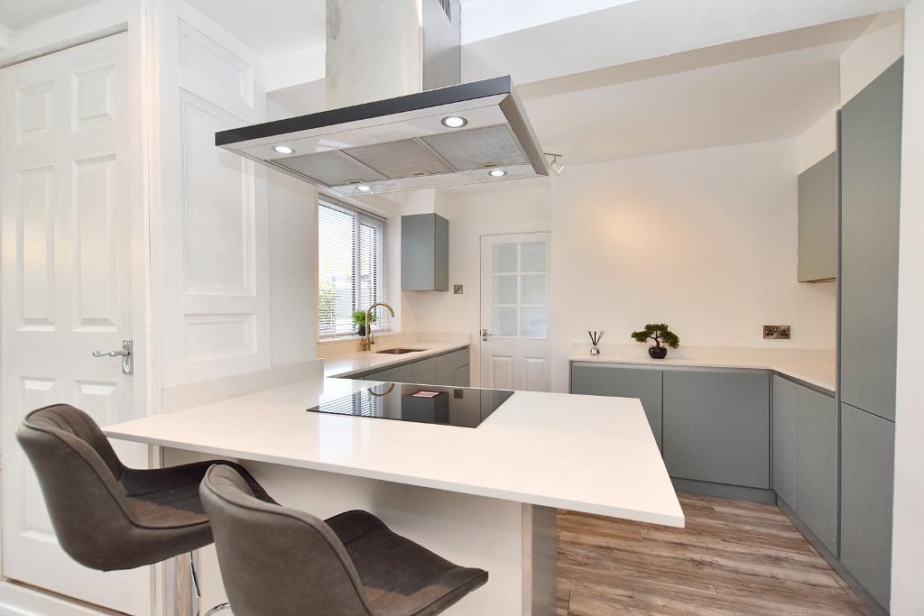 Kitchen Area: 1.8m x 3.5m (6"0" x 11"6"); with a contemporary range of handleless wall and base units with complementary white quartz worktop and splashback, one-and-a-half bowl built under stainless steel sink unit with brushed steel mixer tap and draining board carved into worktop, integrated electric fan oven, 4-ring ceramic hob with stainless steel extractor canopy over, integrated dishwasher and fridge-freezer, breakfast bar and utility cupboard with plumbing for a washing machine.