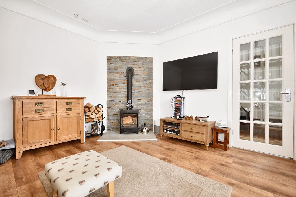 Living room: 3.7m x 4.4m (12'2" x 14'4"); with a multi-fuel burner set on a stone tiled hearth with slate back, laminate wood effect flooring, television point and telephone point.