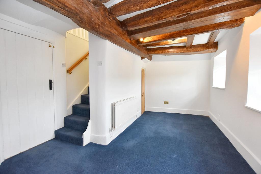 Hallway: Large hallway with study area with 3 windows, feature exposed beams, staircase off to first floor with understairs storage cupboard and wall light points.