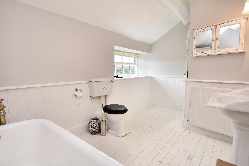 Bathroom: 3-piece Sanitan heritage style suite with low suite w.c., pedestal wash-hand basin and freestanding roll top bath with shower tap fitment, tongue and groove walls to dado height, wall light points and excellent outlooks across Stonyhurst playing fields.