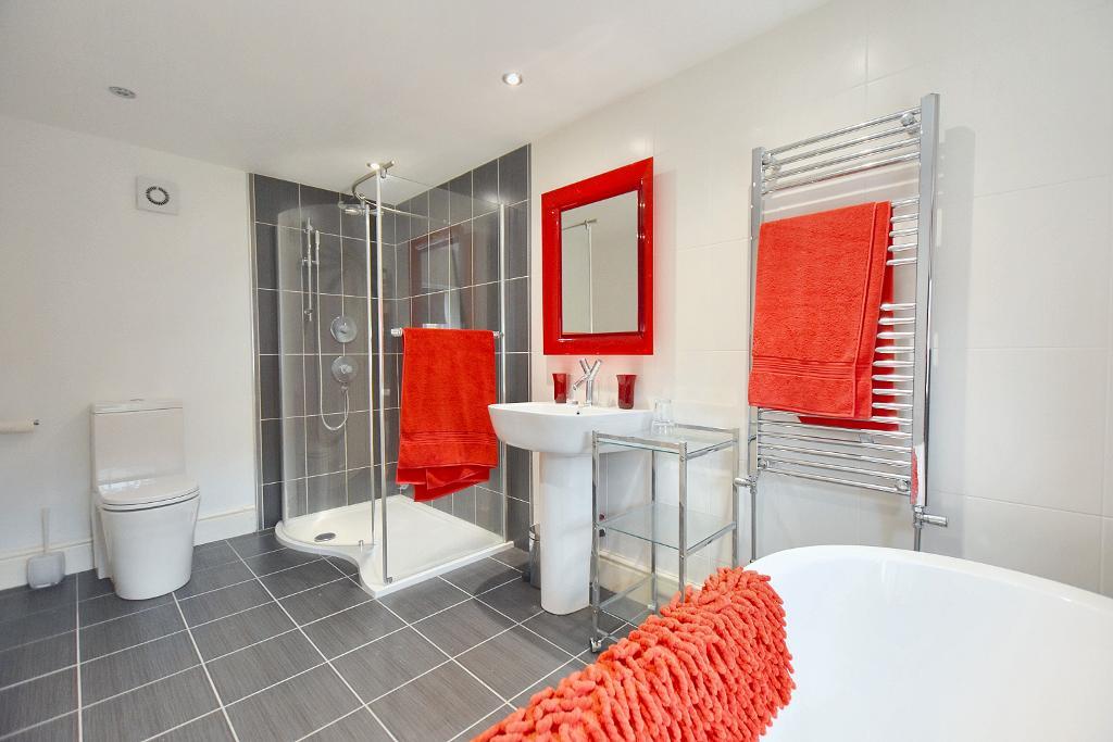 EN-SUITE BATHROOM: 4-piece modern white suite comprising low suite w.c. with push button flush, pedestal wash-hand basin with chrome mixer tap, freestanding bath with wall-mounted chrome shower tap fitment, walk-in shower with fitted thermostatic shower with fixed showerhead and separate handheld showerhead, chrome heated ladder style towel rail, tiled floor, part-tiled walls, extractor and recessed spotlighting.
