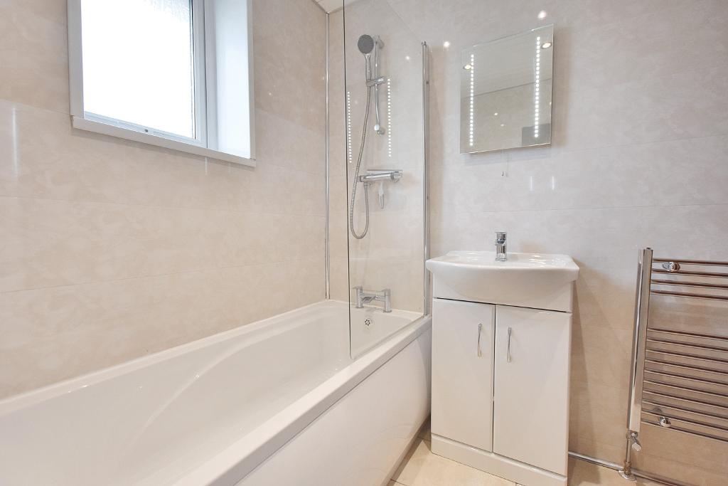 Bathroom: Modern 3-piece white suite comprising a low suite w.c. with push button flush, vanity wash-hand basin with storage cupboards under and chrome mixer tap with vanity mirror with LED lighting over, panelled bath with chrome tap, chrome thermostatic shower and glass shower screen. Chrome heated ladder style towel rail, mermaid splash panel walls, recessed spotlighting, extractor fan and over stairs storage cupboard with shelving for linen.