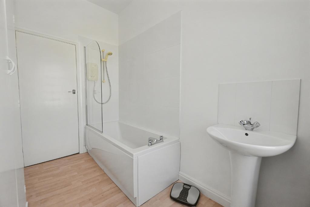 BATHROOM:: with a modern 3-piece white suite comprising low suite W.C with push-button flush, pedestal wash handbasin with chrome mixer tap, panelled bath with electric Mira Sprint shower over and glass shower screen, airing cupboard with hot water cylinder.