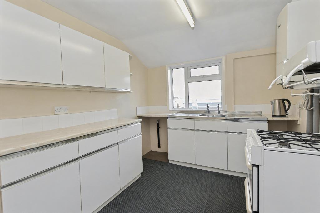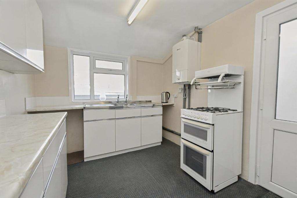KITCHEN:: 8' 2'' x 10' 9'' (2.5m x 3.3m) with a fitted range of white wall and base units with complimentary laminate work surface and tiled splashback, stainless steel two drainer sink unit, gas cooker, wall-mounted Worcester central heating boiler and half-glazed PVC door to rear yard.