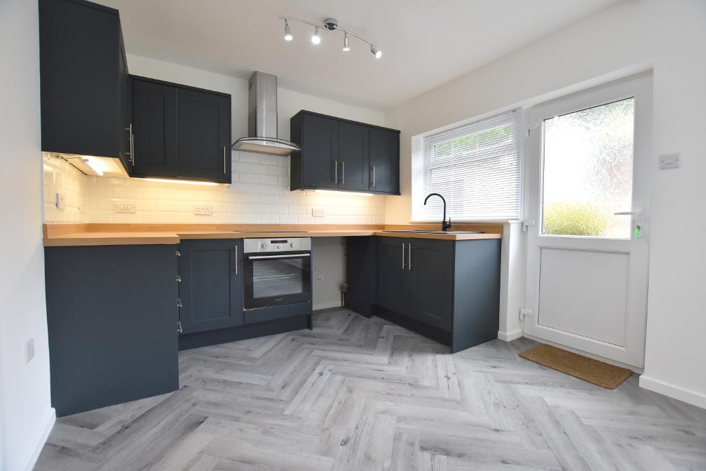 KITCHEN AREA: Fitted range of dark grey shaker-style wall and base units with complementary wood-effect laminate work surfaces and tiled splashbacks, Samsung integrated fan oven, Samsung 4-ring ceramic hob with curved glass and stainless-steel extractor canopy over, one bowl single drainer sink unit, plumbing for washing machine, space for fridge freezer, half glazed PVC door to rear garden.