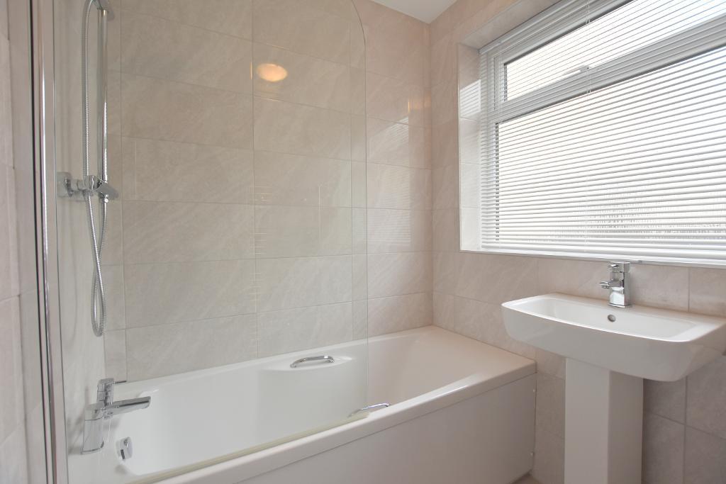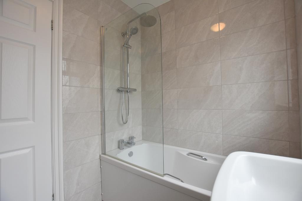BATHROOM: With three-piece white suite comprising low suite w.c. with push button flush, pedestal washbasin with chrome mixer tap, panelled bath with chrome mixer tap and thermostatic shower over with fixed shower head and separate handheld shower head, glass shower screen, fully tiled walls, tiled floor, chrome heated ladder-style towel rail.