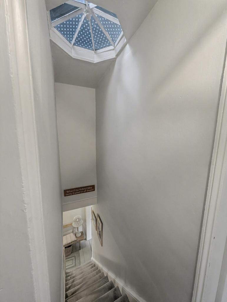 Landing: staircase to the second floor, boarded flooring, low voltage lighting.
