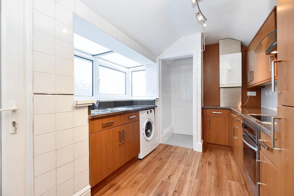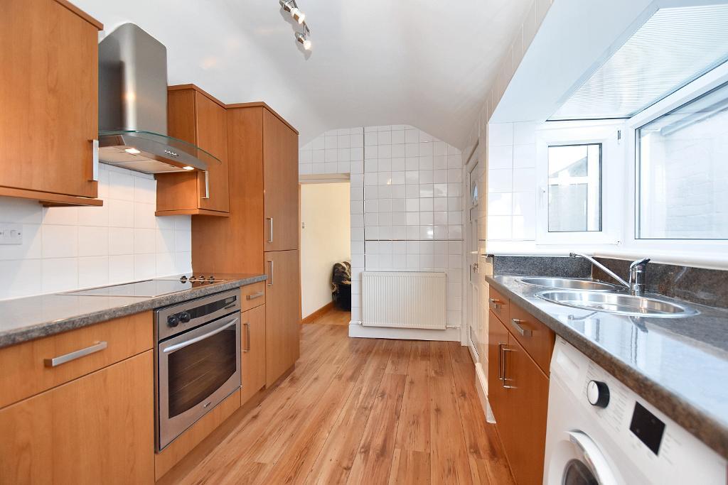 Kitchen: 2.7m x 4.1m (8'9" x 13'7"); with a fitted range of wood effect wall and base units with complementary laminate work surface and tiled splashback, 2 stainless steel circular sink units with mixer tap, integrated stainless steel electric fan oven, 4-ring ceramic hob with stainless steel extractor canopy over, tall cupboard to store fridge and freezer, plumbing for a washing machine, PVC bay window and PVC door to rear yard.