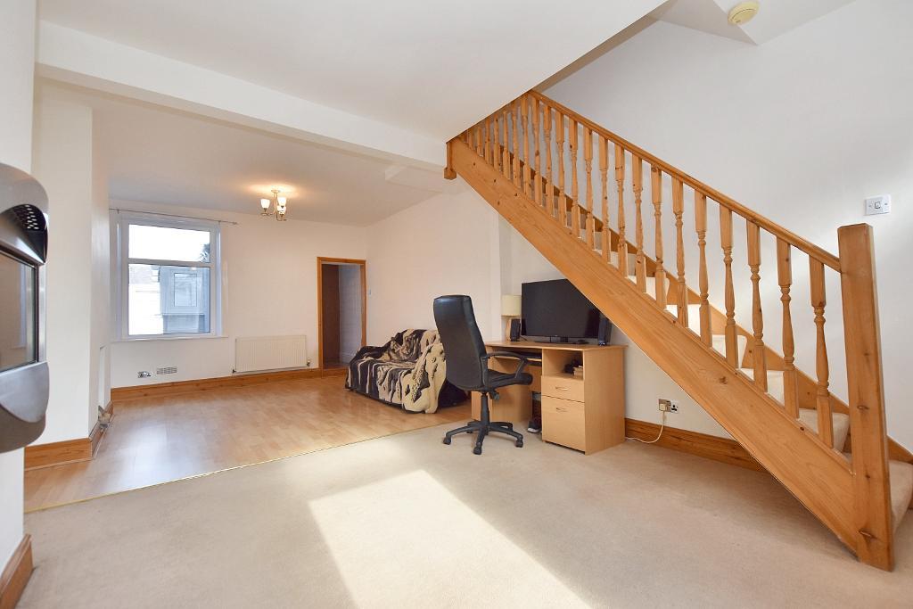 Open-plan through lounge & dining area: 3.9m x 3.6m + 4.0m x 3.6m (12'9" x 11'9" + 13"0" x 11"11"); with wall-mounted contemporary gas fire, staircase off to first floor with spindles and balustrade and windows to front and rear.