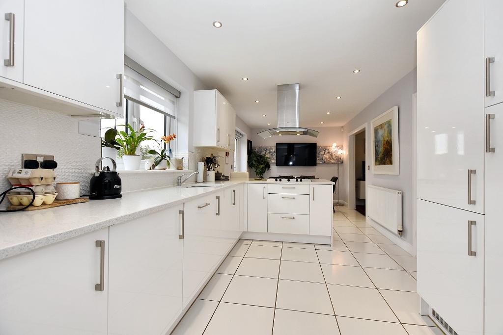 Dining kitchen: 6.9m x 2.8m (22"8" x 9"3"); an open-plan dining kitchen with a fitted range of white gloss wall and base units with white quartz work surface and tiled splashback, built under ceramic sink unit with chrome mixer tap, integrated double electric oven, 5-ring gas hob with ceiling-mounted stainless steel and curved glass extractor canopy over, integrated dishwasher and fridge-freezer, breakfast bar, ceramic tiled floor, dining area with space for 6-seater dining table and chairs, television point and glazed PVC French doors opening onto rear garden.