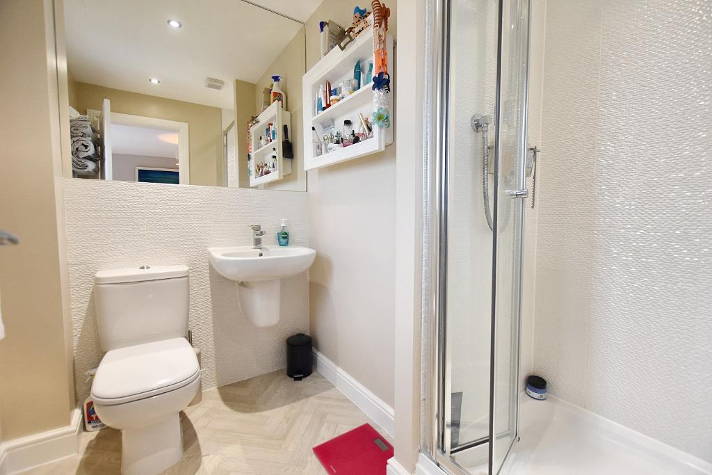 En-suite shower room: 3-piece Duravit white suite with low suite w.c. with push button flush, wall-mounted semi-pedestal wash-hand basin with chrome mixer tap, fitted shower enclosure with thermostatic shower, part-tiled walls, recessed spotlighting and extractor fan.