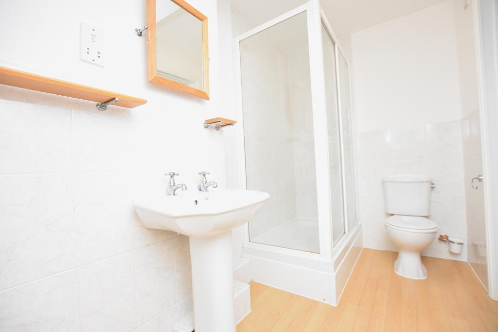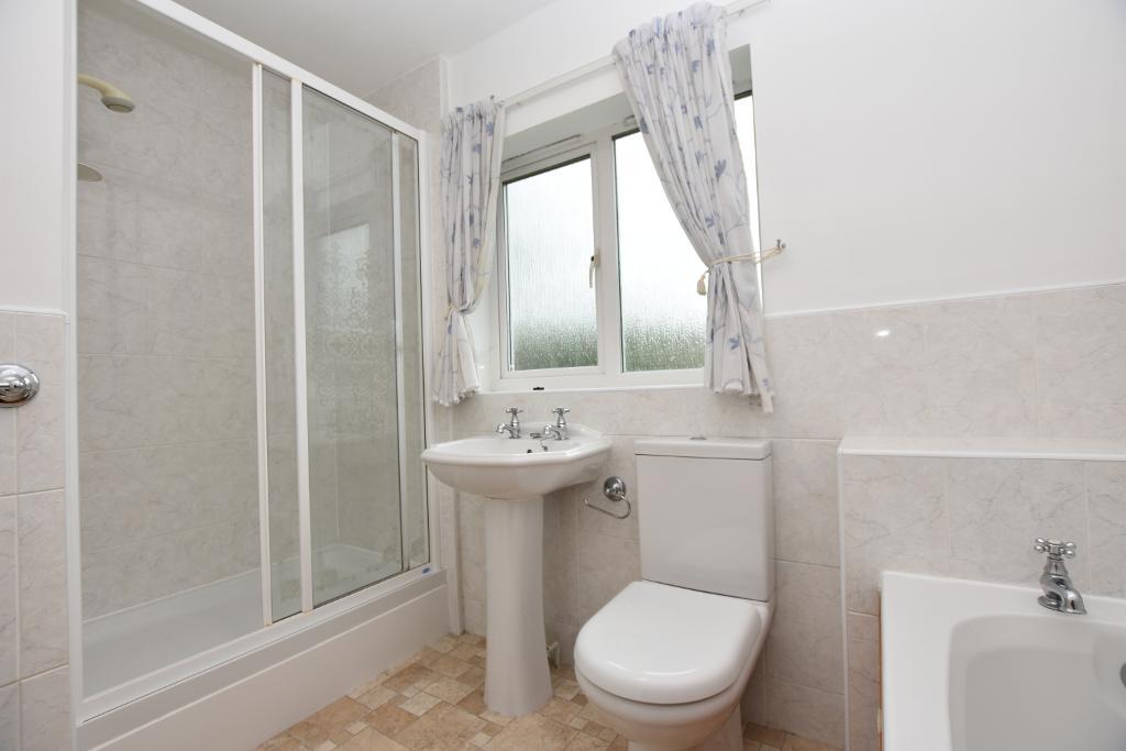En-suite: 3-piece white suite comprising low suite w.c., pedestal washbasin and walk-in enclosure housing thermostatic shower.