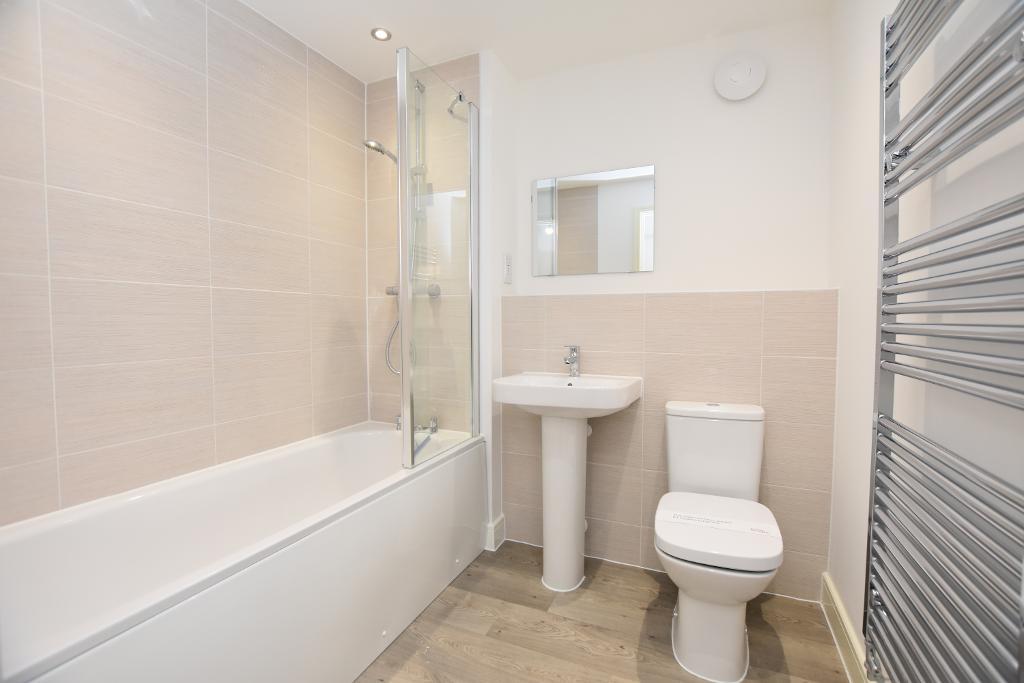 Bathroom: 3-piece white Roca suite comprising a low suite w.c. with push button flush, pedestal wash-hand basin with chrome mixer tap and vanity mirror over and a panelled bath with chrome mixer tap and thermostatic shower over with glass shower screen, part-tiled walls, tall heated chrome towel rail, extractor fan, recessed spotlighting and shaver point.