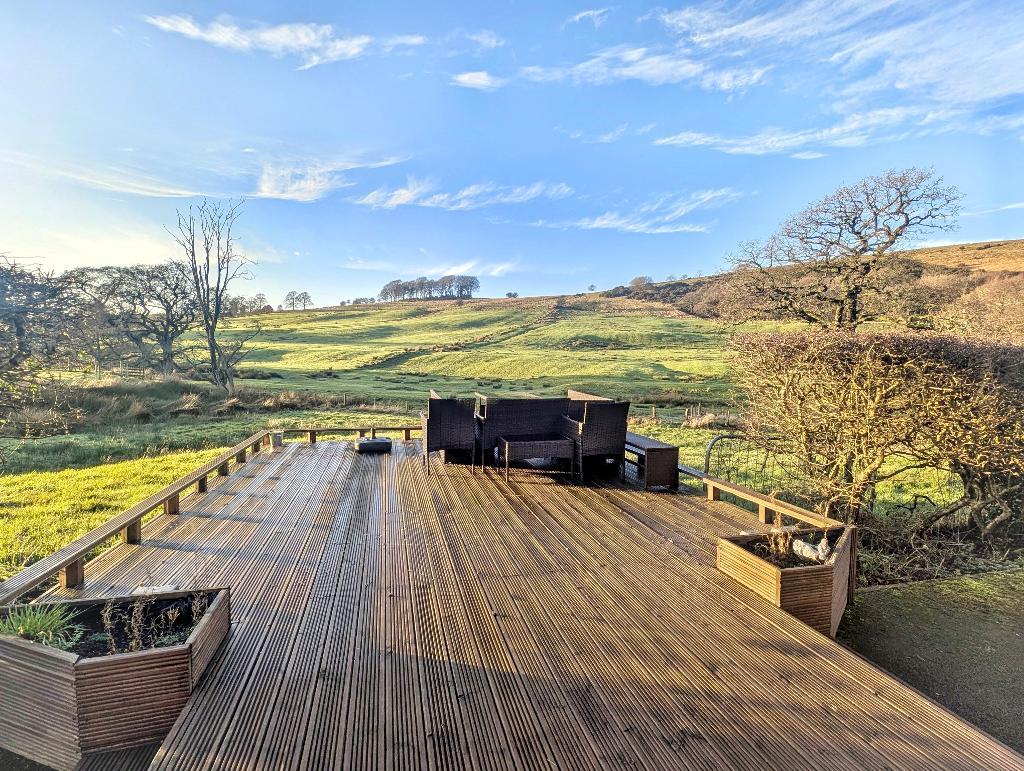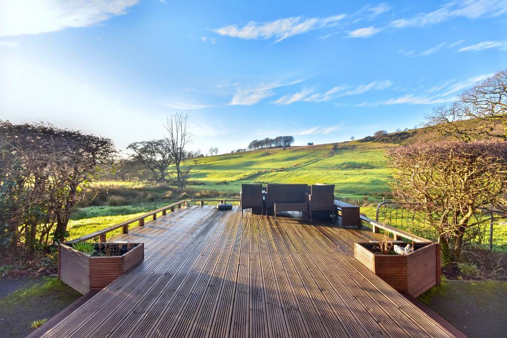 L-shaped entrance hallway, large open flowing living space comprising a living area with fireplace which opens to a lounge with French doors onto a raised decked patio. An extended dining kitchen provides ample space for most and benefits from a large utility room. In addition, there are 3 good double bedrooms and a 4-piece bathroom.