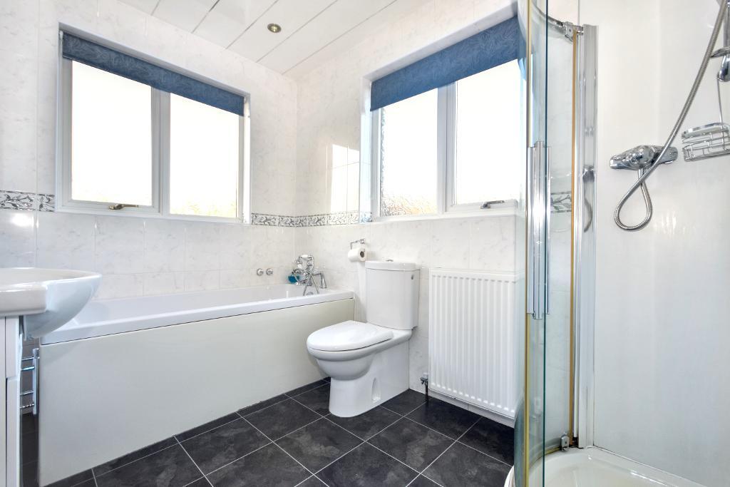 BATHROOM: with a 4-piece suite comprising a low level W.C. vanity wash hand basin, panel bath, corner shower enclosure with a plumbed shower, heated stainless steel towel rail, fully tiled walls, low voltage lighting.