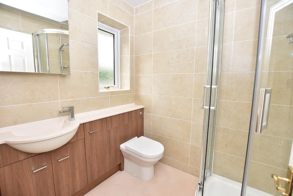 EN-SUITE SHOWER ROOM: Housing modern 3-piece suite comprising low suite w.c, moulded Corian vanity washbasin, corner shower enclosure with fitted Hans Grohe and heated ladder style towel rail.