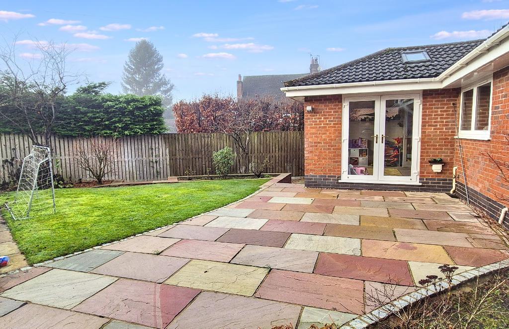 Lawned garden with Indian stone paved pathway to front door, tarmacadam driveway providing parking for 3-4 cars, leading to garage and access alongside the house leading to an enclosed rear garden which has a large Indian stone flag patio area, lawn with planting borders and timber storage shed.