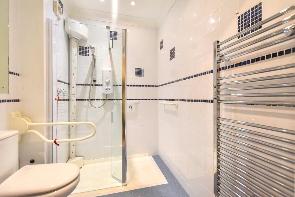 Shower room: Modern 3-piece white suite comprising a low suite w.c. with push button flush, wall-hung semi-pedestal wash-hand basin with chrome taps, low rise shower tray with walk-in shower with fixed glass panel with fitted Mira electric shower, chrome heated ladder style towel rail, fully tiled walls, recessed spotlighting and extractor fan.