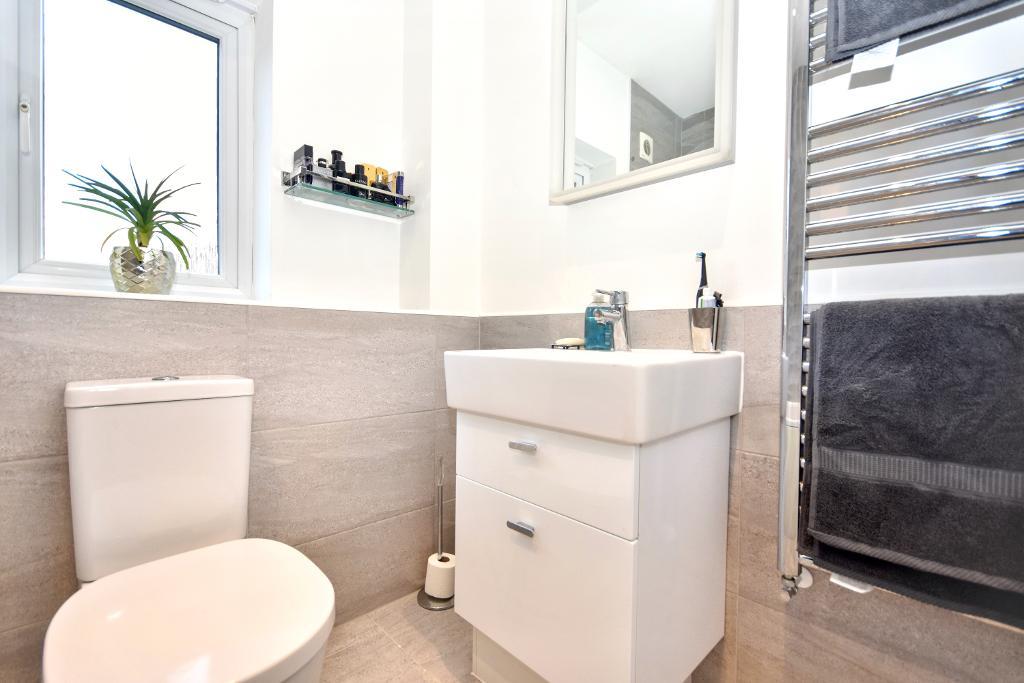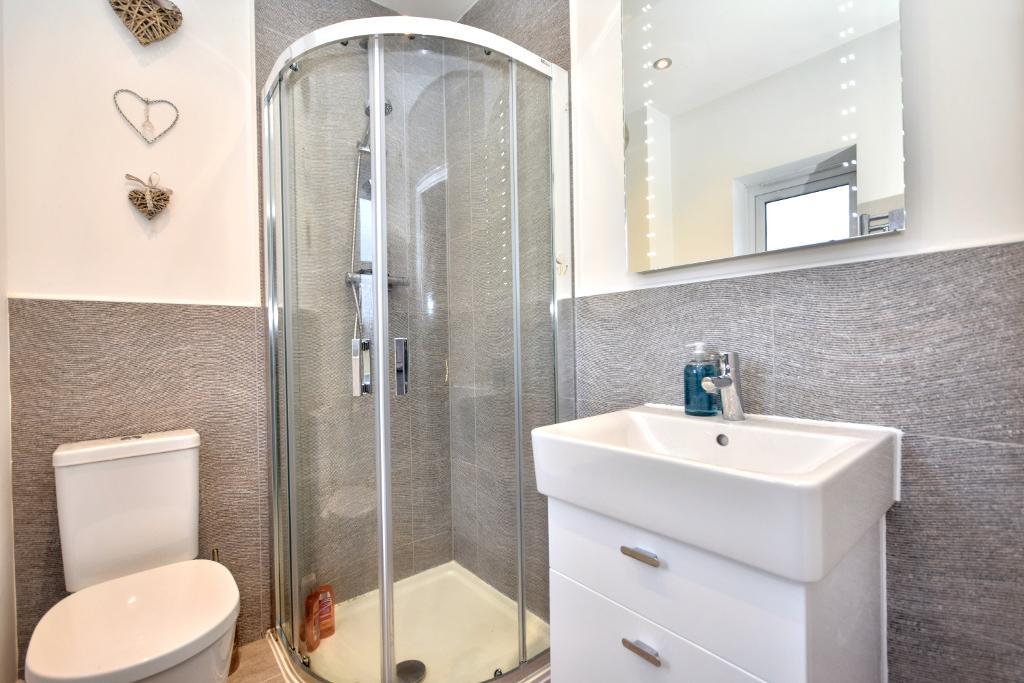 EN-SUITE SHOWER ROOM: 3-piece suite in white comprising a low level w.c., pedestal handwash basin, vanity sink unit, half tiled walls, heated stainless steel towel rail, tiled flooring, low voltage lighting and extractor fan.