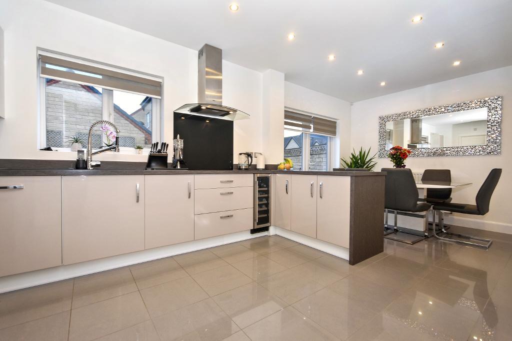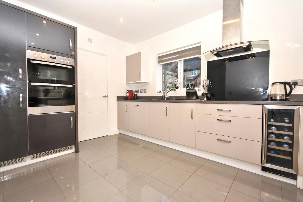 DINING KITCHEN: 6.2m x 3m (20"4" x 9"9"); with an upgraded fitted kitchen and appliances. with basin wall level storage cupboards and soft close drawers, a range of built in appliances including fridge/freezer, double electric oven and grill, 4 ring induction hob with a stainless steel extractor over, wine chiller, dishwasher, one and a half bowl sink unit, tiled flooring, low voltage lighting, French doors to the rear garden, integral door to the garage and understairs storage cupboard with consumer unit.