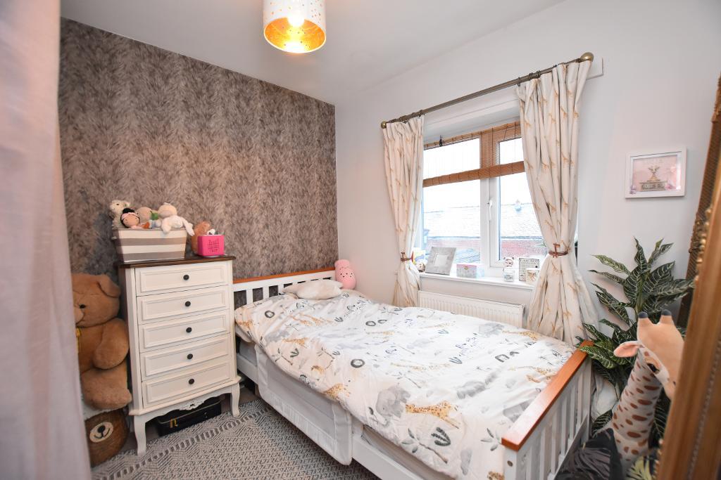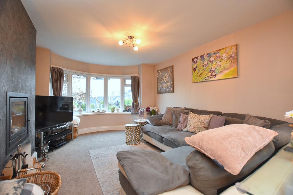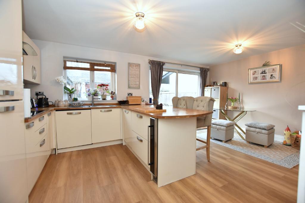 The welcoming hallway leads to a bright lounge featuring a bay window and a cosy log burner. To the rear, you"ll find an impressive open-plan dining kitchen, complete with a range of integrated appliances, breakfast bar, and patio door opening onto the garden—ideal for family living and entertaining. Upstairs, there are three well-proportioned bedrooms and a contemporary four-piece bathroom with a separate shower.
