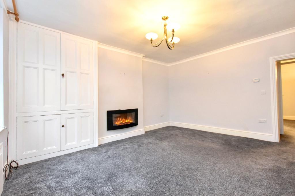 Lounge: 4.0m x 4.4m (13'3" x 14'6"); with television point, modern contemporary wall-mounted electric fire, original storage cupboards built into alcove and staircase off to first floor.
