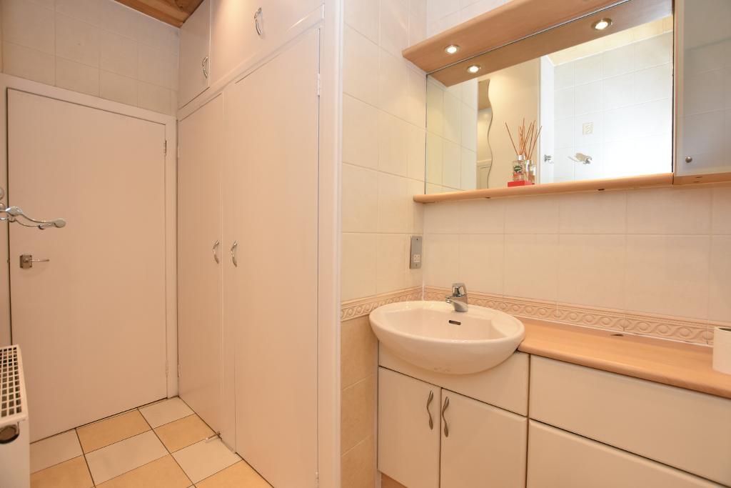 BATHROOM: Housing 3-piece suite comprising concealed w.c., vanity washbasin with mirrored cupboard unit over, panelled bath with electric shower over, airing cupboard housing central heating boiler.