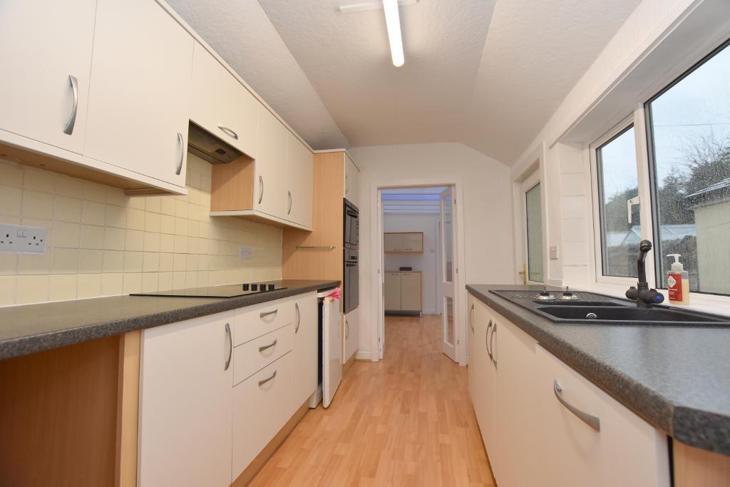 KITCHEN: 2.3m x 4m (7"5" x 13"1"); with a range of fitted wall and base units with complementary laminate working surfaces, dishwasher, washing machine, low level fridge, integrated oven, integrated microwave, 4-ring induction hob and extractor over, one and a half bowl sink & draining unit, external door to rear yard.