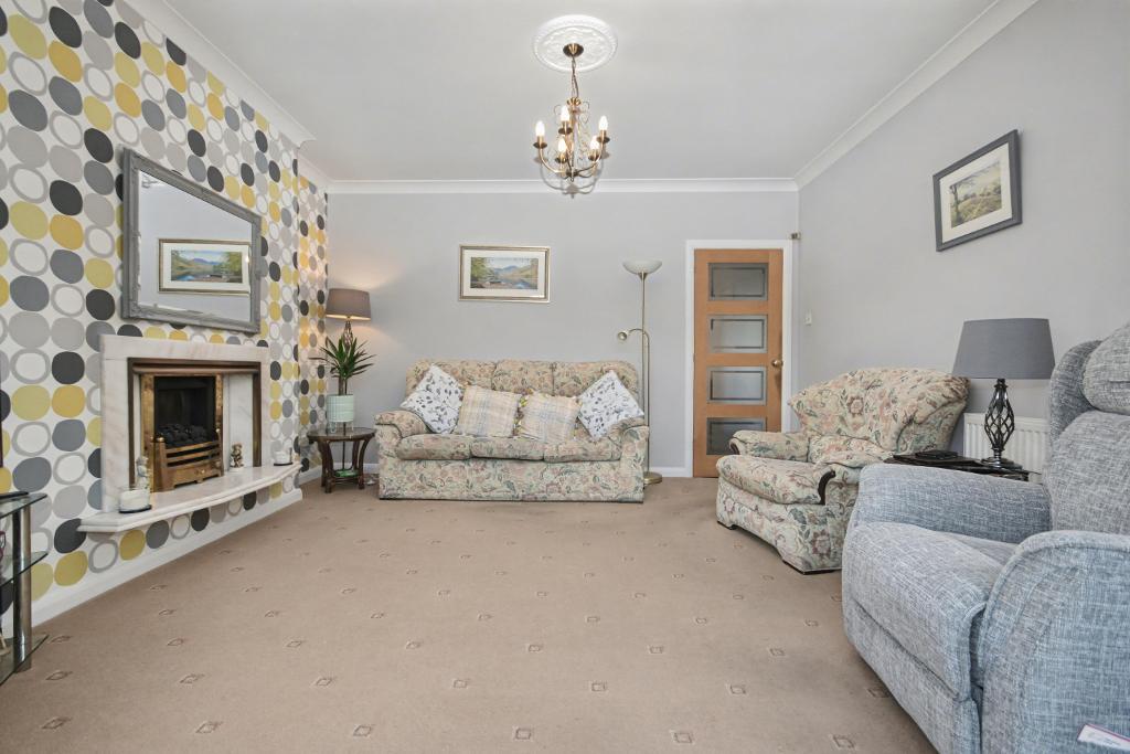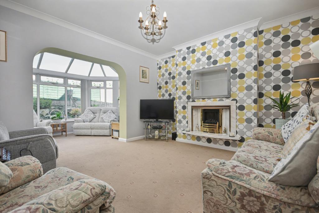 Lounge: 4.1m x 3.7m (13'4" x 12'2"); with a living flame gas fire in a feature surround, television and telephone points, open to: