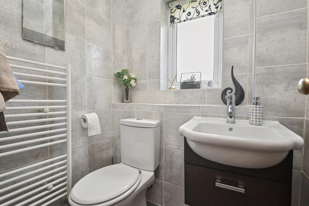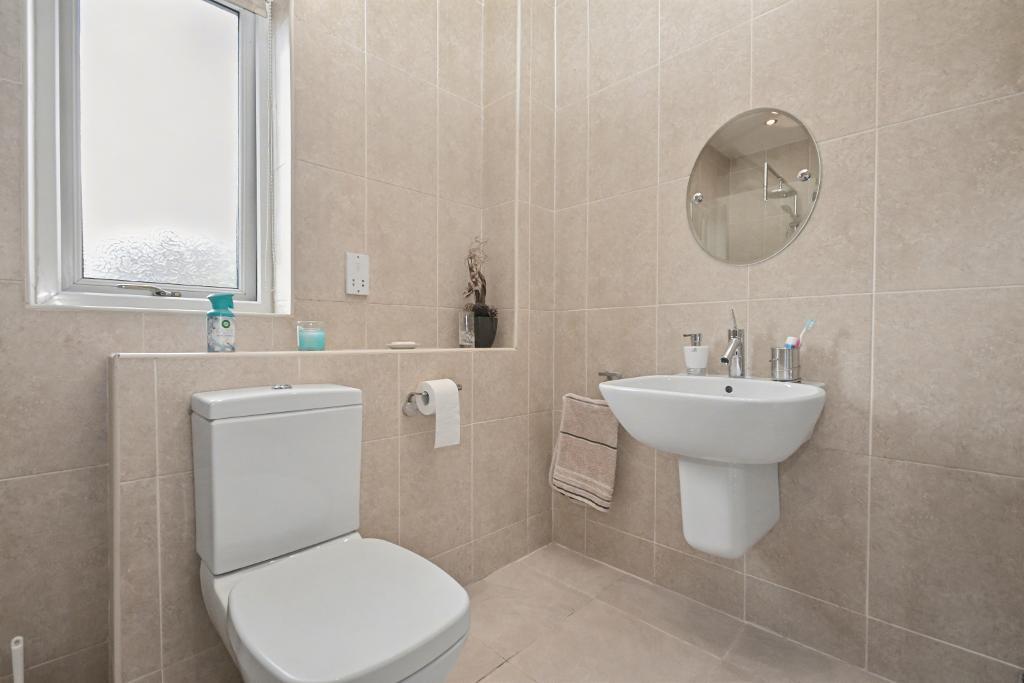 Cloaksroom: with a modern two-piece suite in white comprising a low level W.C and wash handbasin, fully tiled walls, tiled floor, heated towel rail.