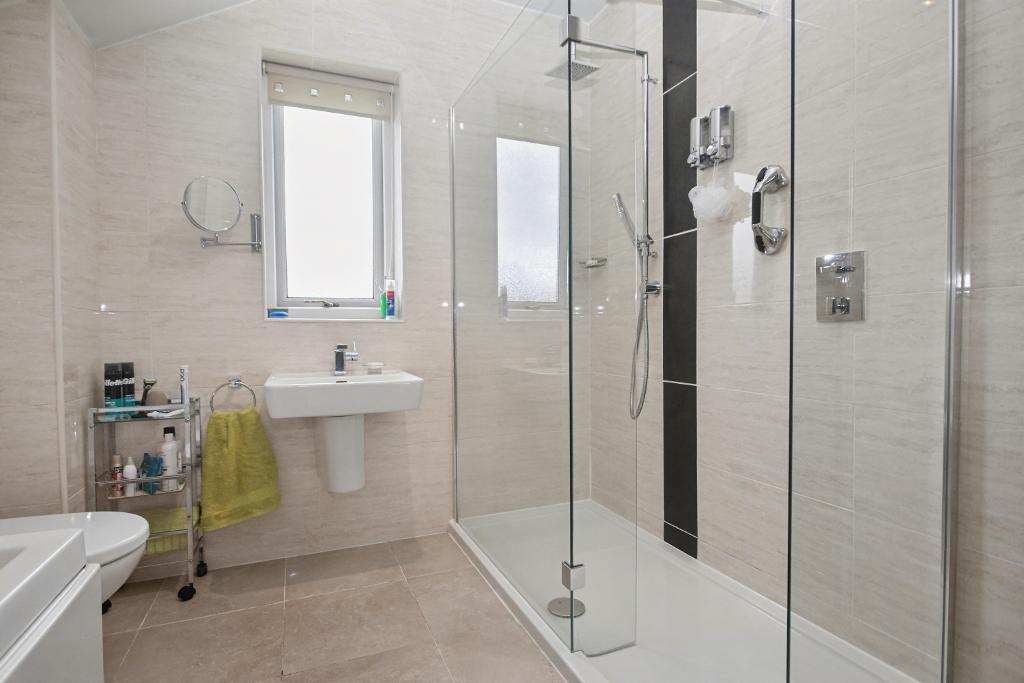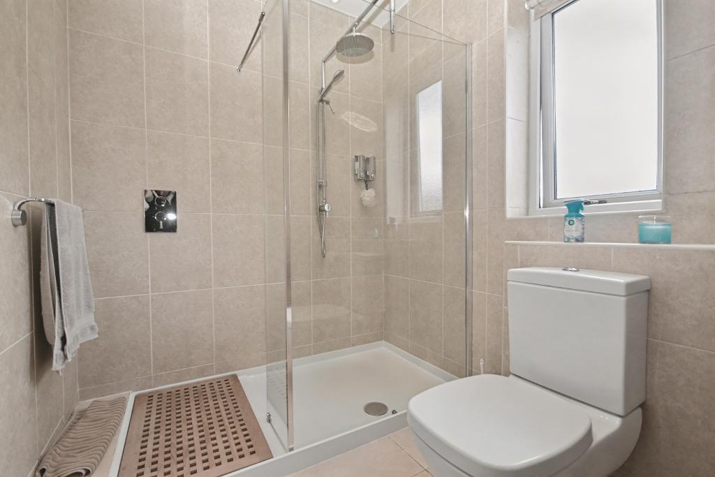 House Shower Room: 1.8m x 2.7m (6'0" x 8'11"); with a modern three-piece suite in white comprising a low level W.C, wash handbasin and a walk-in shower enclosure with plumbed overhead shower and mixer tap, heated stainless steel towel rail, low voltage lighting, extractor fan.
